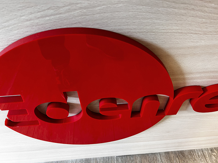 La découpe haute fréquence de lettres en plexi donne un look unique à votre communication. C’est un peu plus cher et un peu plus long à produire mais ça donne un très beau résultat.